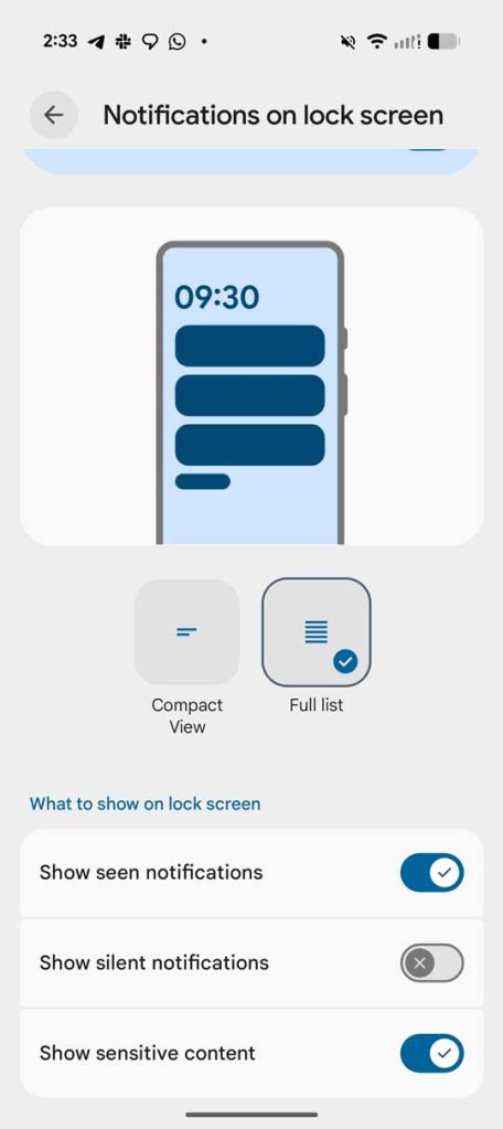 Some notification settings can now be accessed via the lock screen settings. Instead of a single “Show notifications on the lock screen” option, there is now a full menu with view settings and several toggles. That includes a compact and full view, as well as a brand new option called “Show seen notifications.” This will hide notifications after they’ve been viewed, if toggled off.