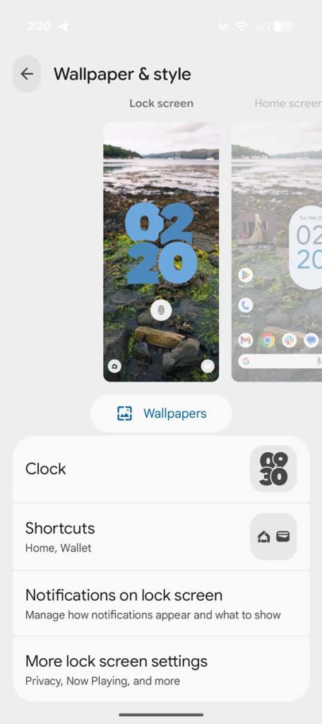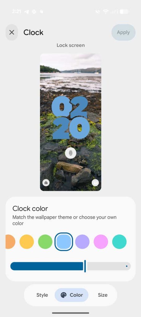That menu offers up buttons with small visualizations of each clock style, making it easier to sift through designs. Colors are also in this menu, and they get a working slider that changes intensity. There is the default Material You color option, along with several other colors to pick from.