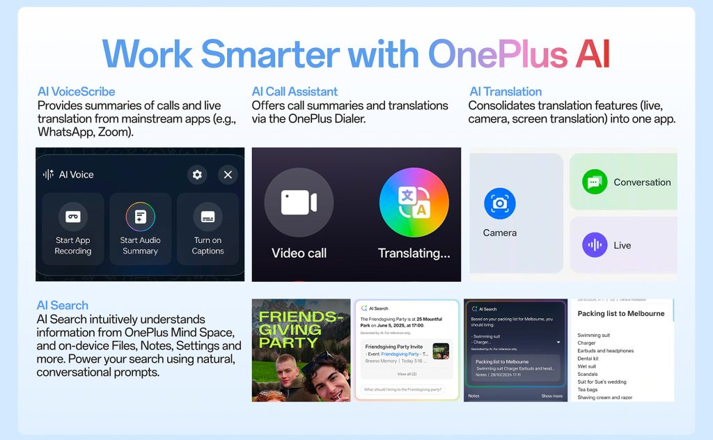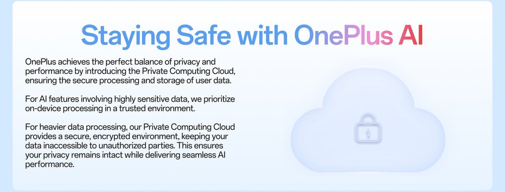 OnePlus notes that it “prioritizes on-device processing within a trusted environment” and leverages a “Private Computing Cloud” for “more intensive” tasks.
