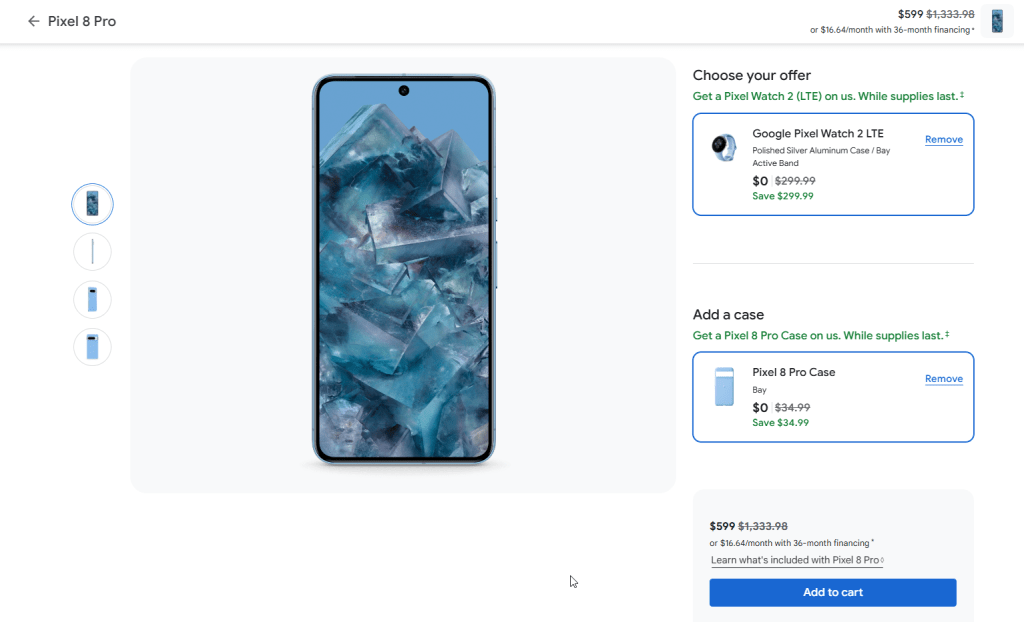Available through the Google Store, you can buy a Pixel 8 Pro for an already-discounted price of $599. That’s down from the original price of $999, and not a whole lot more than you’d pay for a refurbished or open-box device. The discount is only valid for the 128GB model, but all four colors – Bay, Mint, Obsidian, and Porcelain – are all in stock.