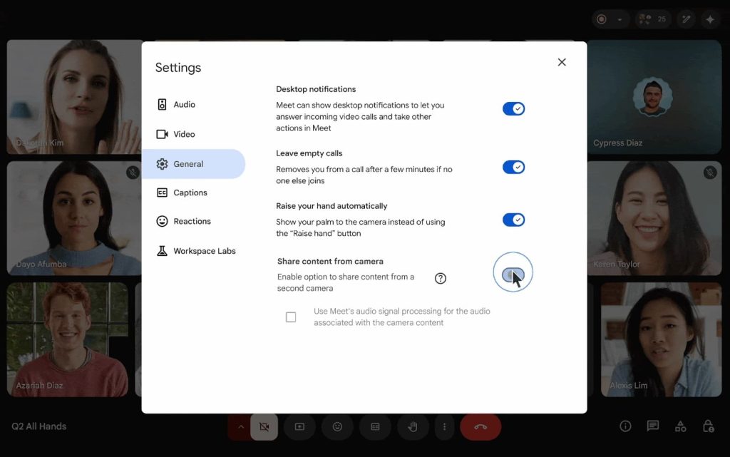 Google also announced today how users can “directly present content from their camera feed into a meeting” at up to 1080p resolution/30 FPS. This can include external and document cameras, as well as video production tools. Use cases include: