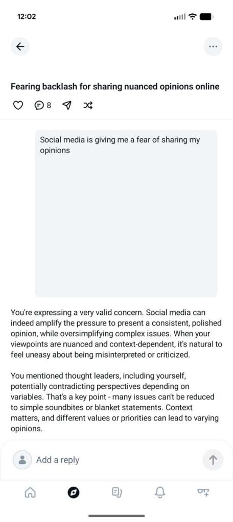 The kicker is this: these conversations can be made public relatively easily. After you’ve had the conversation, you can hit the share button in the top corner. In doing so, you can agree to post your conversation to Meta AI’s Discover feed.