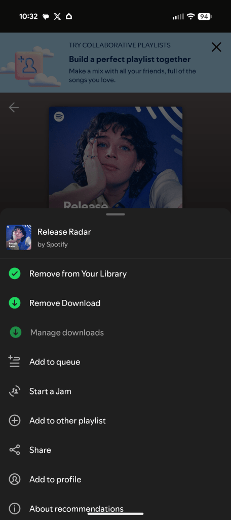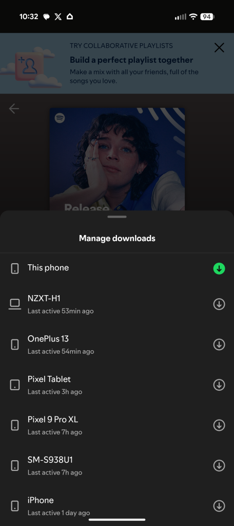 Beyond that, Spotify is also making it easier to see which devices have downloads active. If you tap on the new “Manage downloads” button on a playlist (pictured below), you’ll be able to see a list of your devices and which ones have a playlist downloaded. There doesn’t seem to be a larger menu to show all of these, but it’s still a bit easier than being completely in the dark, especially when you’re nearing the 5-device limit Spotify places on downloads.