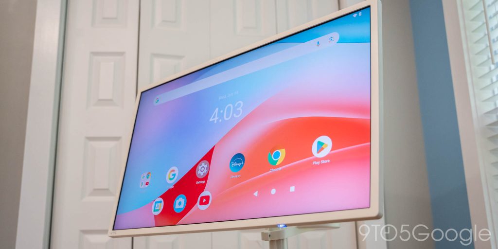 The “MegPad” from KTC is, as described, essentially a 32-inch Android tablet on a pedestal and wheels. The 4K display has a touchscreen, built-in speakers, and can rotate between horizontal and vertical orientations. The display itself has an anti-reflective matte coating and is very sharp given its resolution and size. Even up close, it looks really crisp.