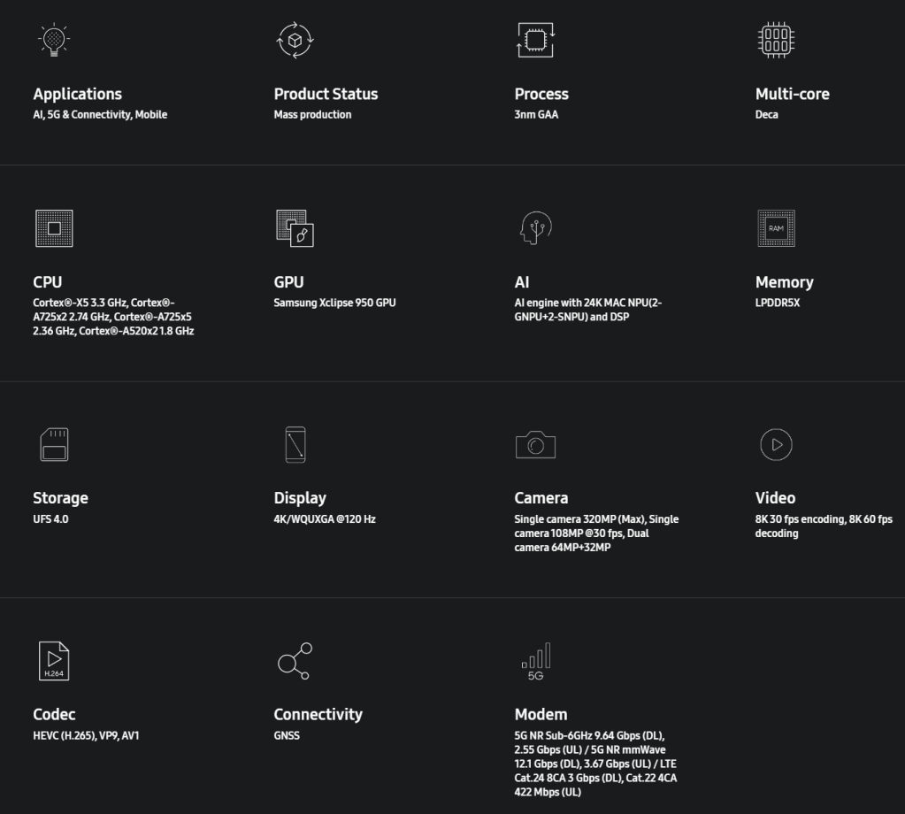 Perhaps most curious — especially when talking about a new Samsung chip — is its modem. Samsung’s being coy about what modem it’s using, delivering a list of specs without specifically referring to anything by name. The company’s Exynos 5400 modem, previously found in last year’s Pixel 9 series, is a near-match on these listed specs, but with slower FR1 and FR2 maximum download speeds.