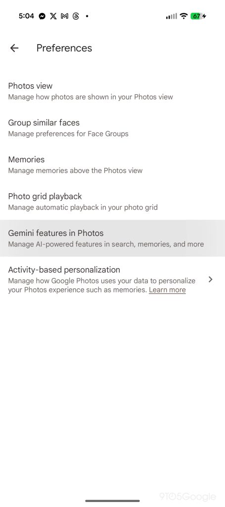 If you have the update, you’ll want to tap on your profile picture and look for “Photos settings.” On that page, tap “Preferences” and then “Gemini features in Photos.”