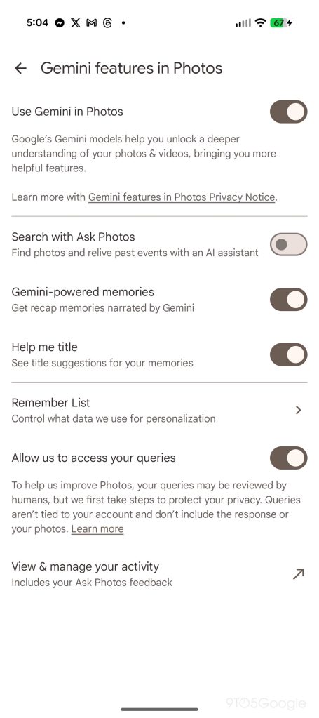 This updated section has several options within, but the one we’re specifically looking for is the toggle for “Search with Ask Photos.” Turning this setting off makes it possible to quickly and fully disable “Ask Photos.” Once flipped, the “Ask” button on the Photos bottom bar converts to “Search” and you’ll get the classic UI.