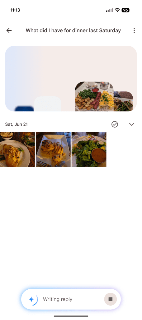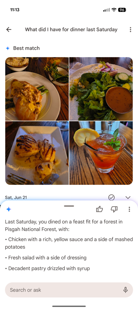 The updated version of Ask Photos meets in the middle of “make everything an AI chatbot” and an experience that many have come to love. When you search, Google starts turning up traditional results almost immediately. Then, after those initial results come up, you’ll see a “Thinking” status which indicates that AI is doing work in the background to expand on the search. When it’s complete, you’ll get any relevant answers you might have asked for. So if I search “What did I have for dinner last Saturday,” Photos will just show me those images immediately, then give me an AI breakdown of the meal, with the ability to follow up on that message for more information.