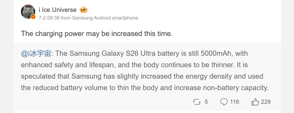 Notable leaker Ice Universe shared some details about the Galaxy S26 Ultra’s battery and charging situation, and it’s a mixed bag. On one hand, it seems like Samsung is once again keeping its flagship’s battery capacity at just 5,000mAh, even as we see various rivals pushing well past this mark. While some Galaxy fans have called on the company to swap to silicon-carbon batteries — like those seen in the OnePlus 13 or Nothing Phone (3) — the technology comes with some downsides of its own. Clearly, even a decade later, Samsung is still somewhat haunted by the Note 7 debacle.