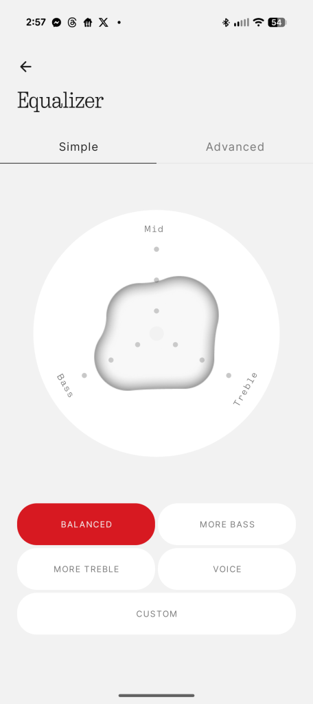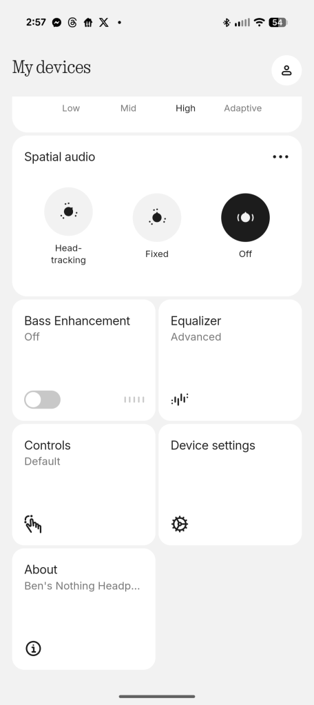That app is primarily needed for ANC customization. While you can toggle it on and off with a long-press of the roller button – which triggers a frankly awful sound of someone breathing if your ear for some horrible reason – Nothing X lets you adjust the strength. And you’ll definitely need that in some cases. The default “Adaptive” mode works well in most environments, adjusting automatically based on your surroundings. But in some situations, you need to manually max it out. That’s what I found on a flight, as “Adaptive” never really felt strong enough. “High” is just enough for a flight, but it’s not as strong as some other headphones I’ve tried. It’s more than good enough, but I was hoping for a bit more. Nothing says ANC can handle up to 42db.