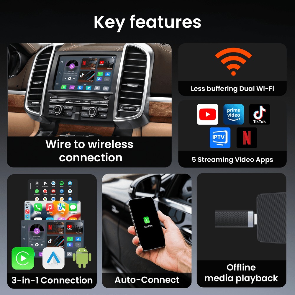 The GetPairr Max Pro takes things a step further than the average adapter by not only supporting Android Auto and CarPlay, but also built-in streaming apps. When you’re not connected to your phone, the dongle can launch streaming apps such as YouTube, Netflix, and more, all with no extra hardware needed.