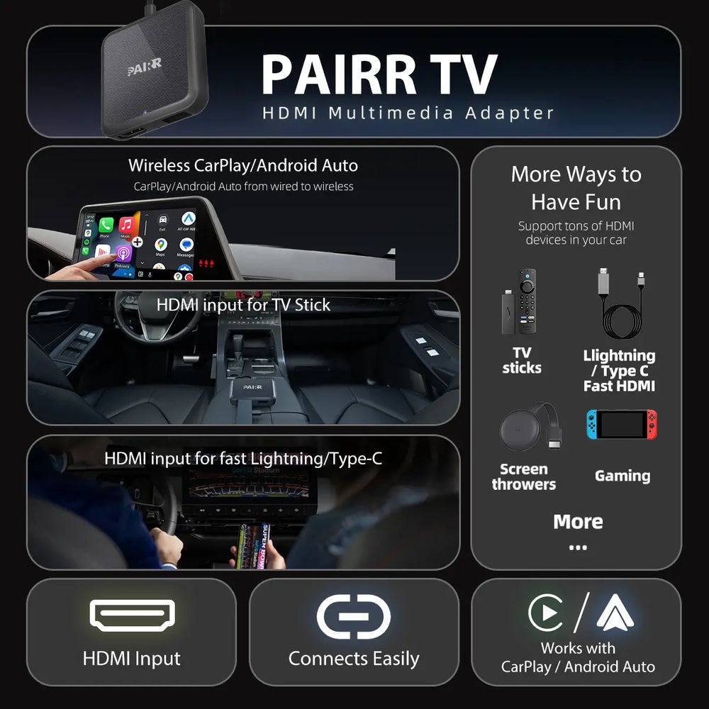 Finally, there’s the clever GetPairr TV, another wireless Android Auto & CarPlay adapter that has a built-in HDMI plug so you can use any device on your car’s display. This could include a Google TV or Fire TV stick, a Nintendo Switch, or anything else you want. It also supports screen mirroring from your phone.