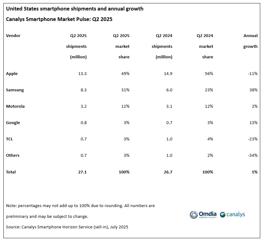 TCL, which previously topped Google, shrunk by 23% YoY in shipping around 700,000 devices in Q2 2025. Other miscellaneous brands also dropped by 34% YoY. Google now stands behind Motorola, which holds a 12% share of the market with 3.2 million shipments in Q2, representing 2% YoY growth.