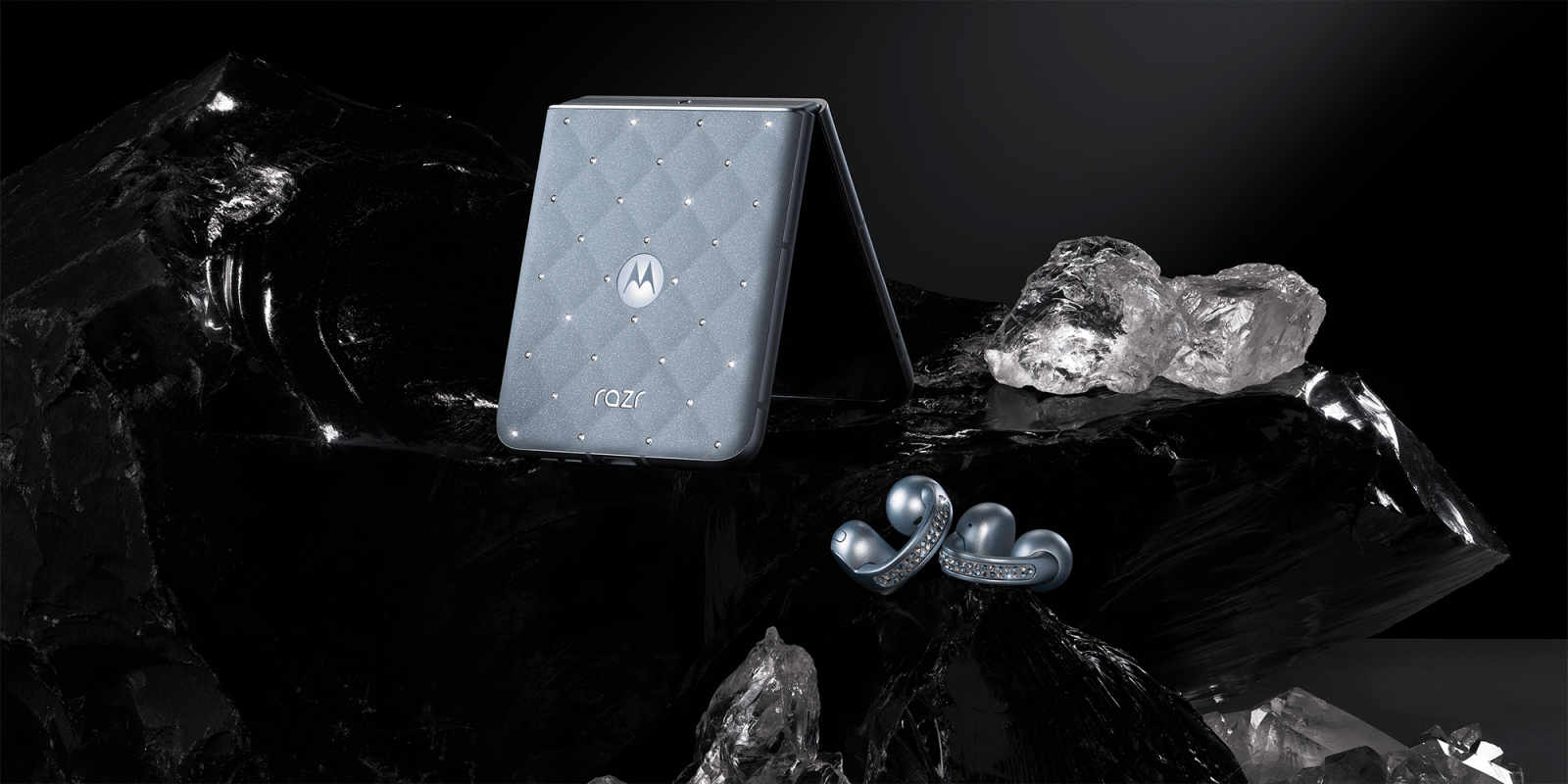 Motorola’s new partnership has created something called “The Brilliant Collection,” which includes bedazzled variants of the Moto Razr (2025) and Moto Buds Loop. Both feature embedded Swarovski crystals scattered around their respective designs; the Razr features 35 “hand-positioned” jewels in a “3D quilted pattern” on Pantone’s new Ice Melt colorway, while the Moto Buds Loop not include an arrangement of gems along each bud’s curved ring. The Razr also uses a faux-leather finish, sticking with Motorola’s recent trend of utilizing unique materials for the lineup.