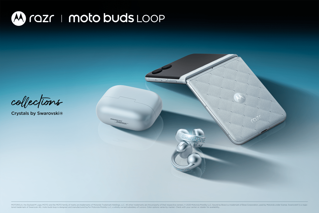 Motorola’s new partnership has created something called “The Brilliant Collection,” which includes bedazzled variants of the Moto Razr (2025) and Moto Buds Loop. Both feature embedded Swarovski crystals scattered around their respective designs; the Razr features 35 “hand-positioned” jewels in a “3D quilted pattern” on Pantone’s new Ice Melt colorway, while the Moto Buds Loop not include an arrangement of gems along each bud’s curved ring. The Razr also uses a faux-leather finish, sticking with Motorola’s recent trend of utilizing unique materials for the lineup.