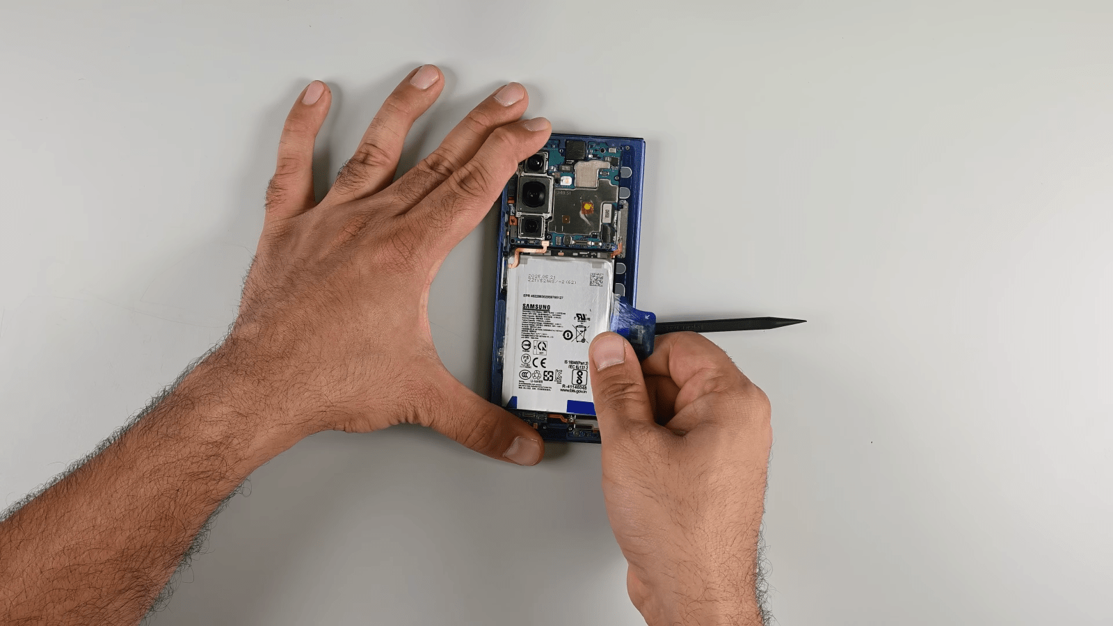 Of course, the Fold 7 has two separate battery cells, which already makes this more difficult than it would otherwise be in a rival slab phone. Taking the back panel off is easy enough, but reaching the first cell requires taking off ribbon cables, removing various screws scattered around the back, and completely disassembling the lower assembly and USB-C power, before finally reaching the battery. As the video points out, Samsung’s using a pull tab method to remove the cell here, rather than the folding sleeve seen on the S25 Ultra. The end result isn’t so much pulling as it is prying; it’s brutal to watch, and we’re only at the first battery.