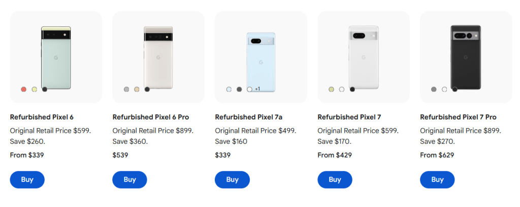 The Google Store houses a handful of discounted, refurbished Pixel phones including the Pixel 6 series and Pixel 7 series. These devices are available for hundreds of dollars off of their original retail pricing, and the Pixel 6a was included until very recently.