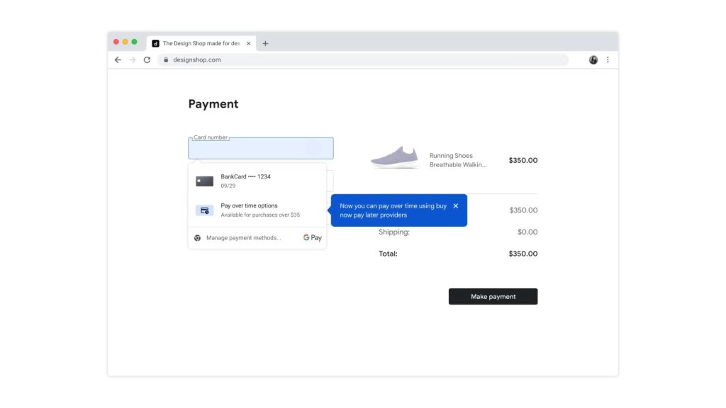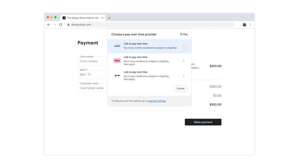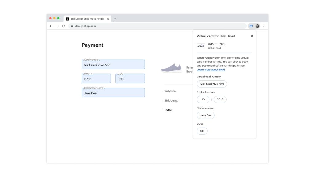 In addition to Affirm and Zip, Klarna, Afterpay, and other providers will appear as “buy now, pay later” (BNPL) options in Chrome autofill. “Pay over time options” will appear beneath credit/debit cards in the menu. You’re then presented with a list of the various options, and can continue from there with a virtual card generated for this purchase.