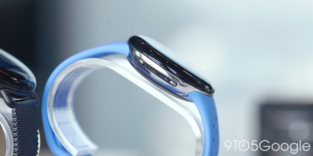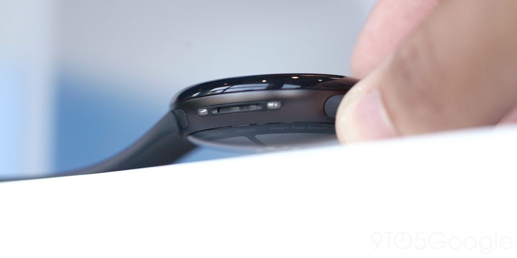 On the left edge, you’ll find two raised contacts at the ends of the speaker cutout. This is for the new charging system that gets you 0-50% in 15 minutes or less. Google went with a third mechanism in four generations because it believes “ultra fast” charging will be a real differentiator. For those that wear their watch all day, top-up sessions are faster than ever.