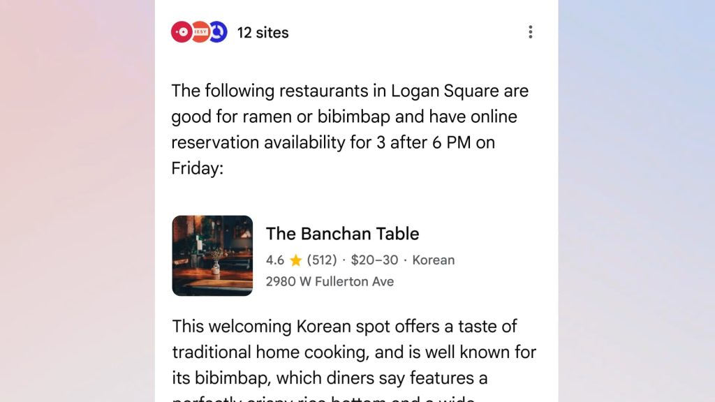AI Mode results will now show personalized recommendations, starting with dining-related topics to help “you discover new restaurants and cafes that match your unique tastes.” This is based on your past chats, as well as your Search and Maps history, if you’ve part of the AI Mode lab.