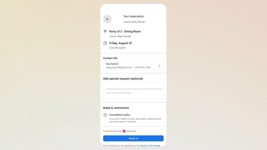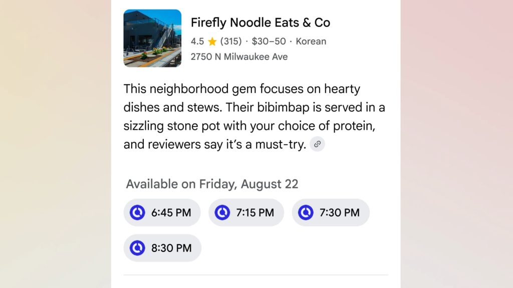 The end result is a curated list of dining options and available time slots. AI Mode will directly link to the booking page so you can finalize the reservation.