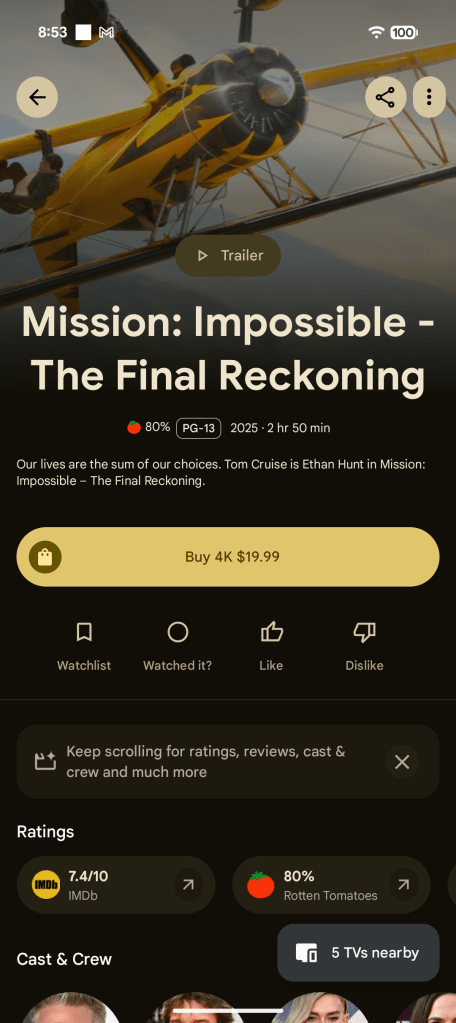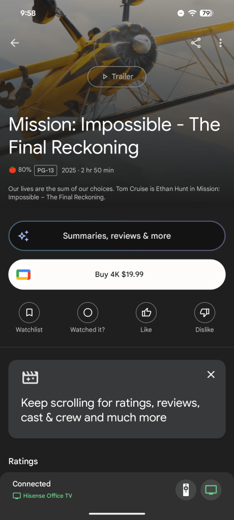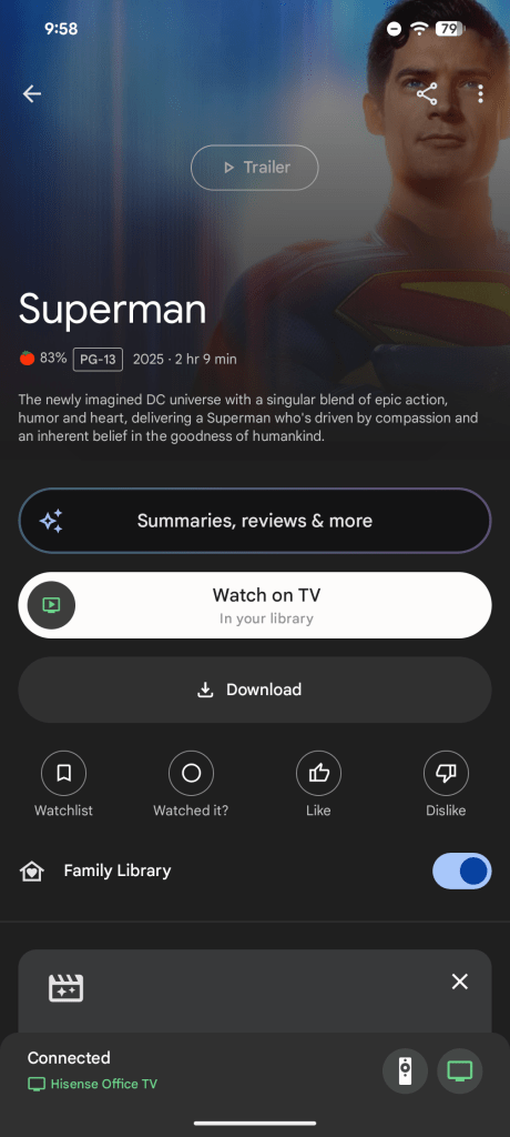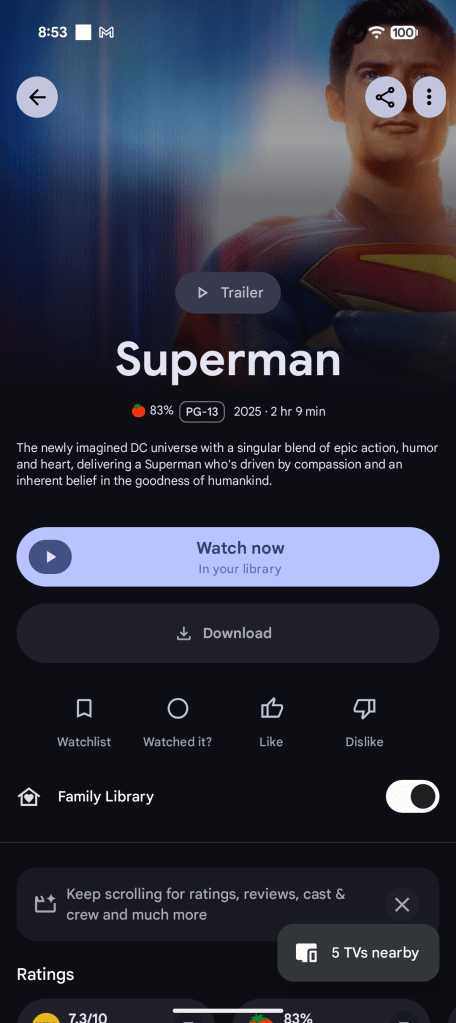 The “For You” tab remains overall similar, but with some more Material You colors, including on the search button. Pages for movies and shows also pick up a lot of added color to match the art from the actual content as well. The new phone remote for Google TV has also been updated, now acting as a full page rather than a sliding pane.