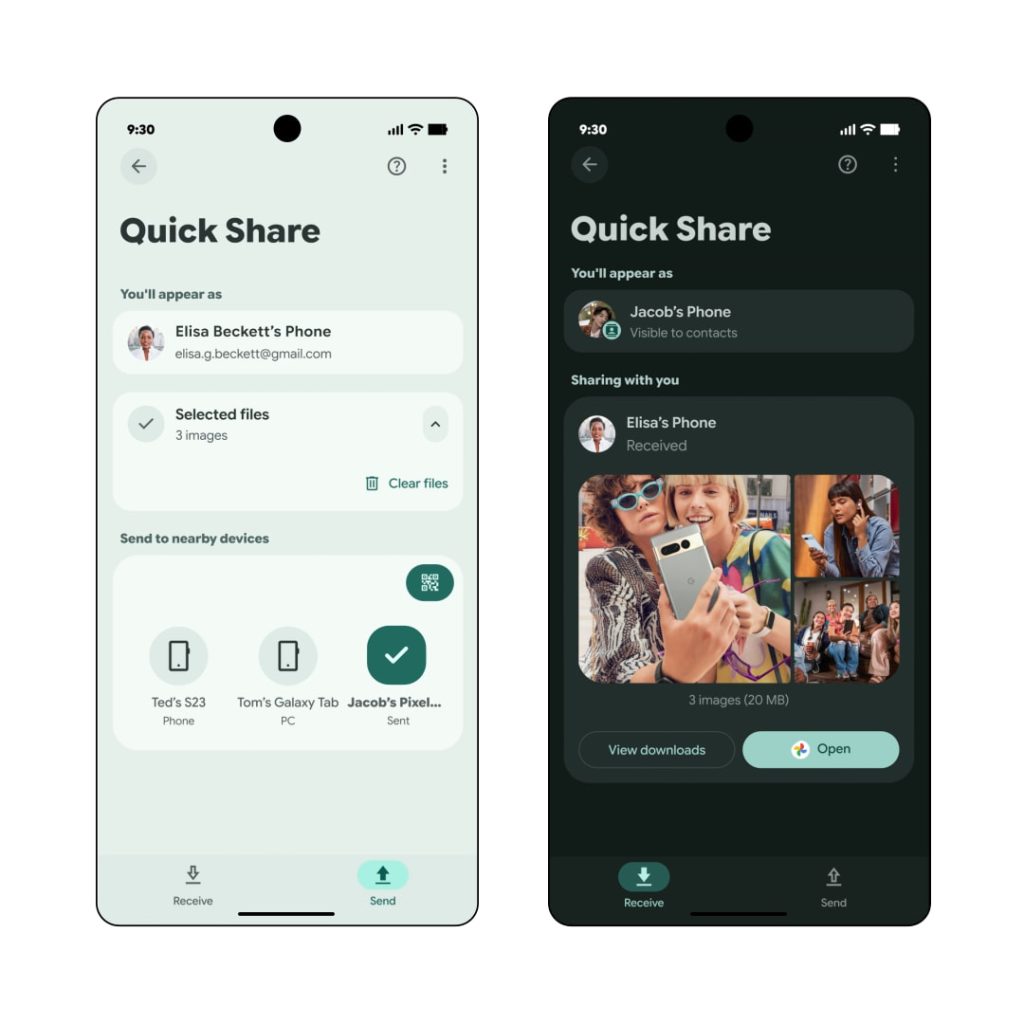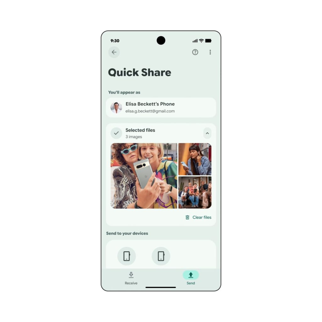 Quick Share is getting a redesign. This fullscreen interface has two tabs in the bottom bar: Receive and Send. This more guided experience lets you “Select files to share” and then the devices you want to send to. Google touts a new progress indicator that “gives you live updates, showing you what percentage of the file has been transferred.”