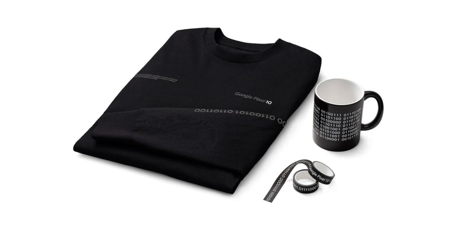$40 Pixel 10 Long Sleeve Tee: “Elevate your essentials and show your love for Google Pixel with this long sleeve shirt. It has a comfortable fit made from ultra soft organic cotton. And look out for the hidden message.” Black with light gray or white text.