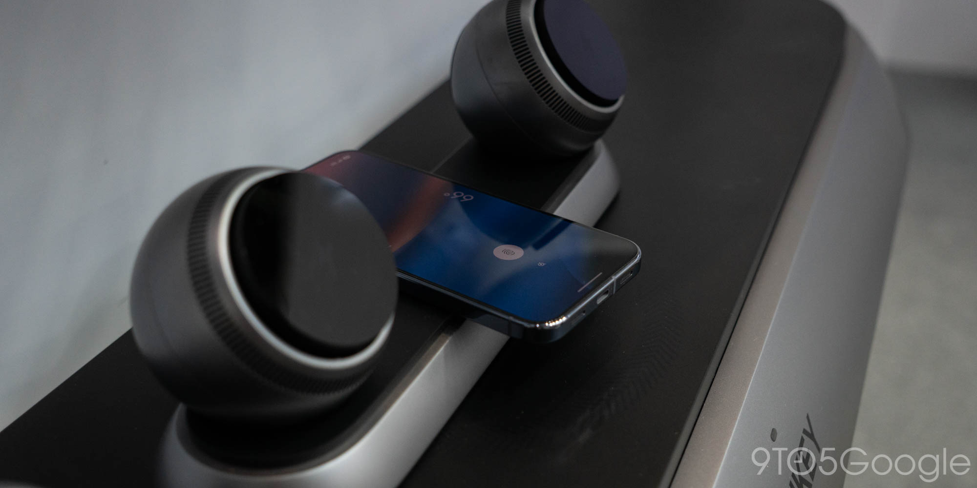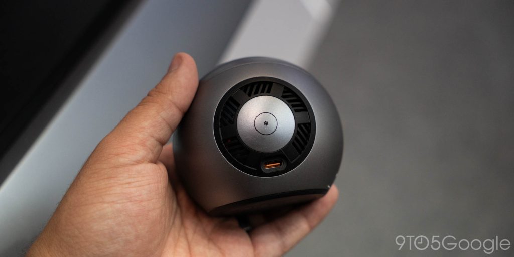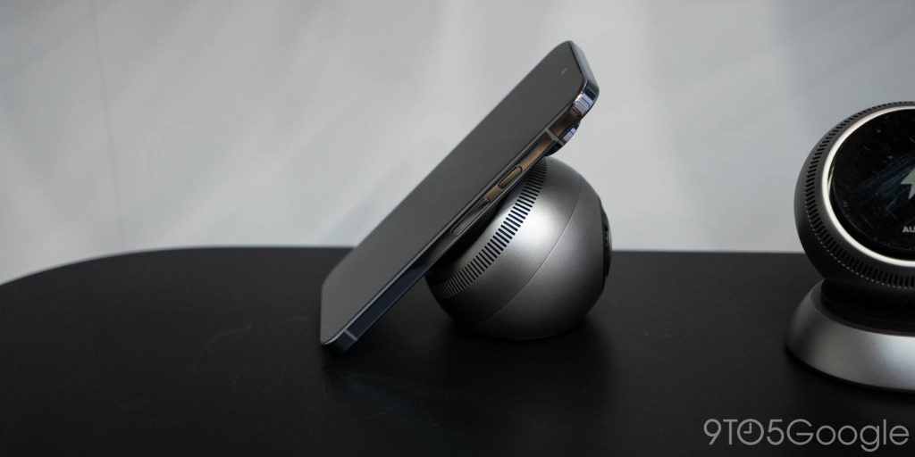 Those spheres also have another clever usability trick, and that’s a posable charging ring. The black portion that actually holds the magnets to connect with your device will adjust by a few degrees in either direction to accomodate for your phone. That’s great because the short stature of the sphere meant that my Pixel 10 Pro XL barely fit, but the angle adjustment meant that the magnets could still hold strongly in place.