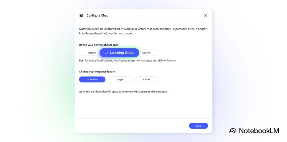 You can now customize the NotebookLM chat with a “Learning Guide” conversational style. Similar to the Gemini app, this “encourages participation with probing, open-ended questions.” This is rolling out starting next week.