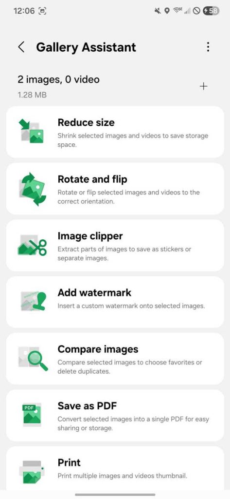 Most of these Gallery Assistant tools are straightforward and appeal to Samsung device users who need simple batch editing tools. Images can be selected at the top of the app, and any of the features chosen will apply to the selected images. For instance, up to 500 images can be selected, and one of the options can be selected to apply to all 500. The “compare” function only works with up to 4 images.
