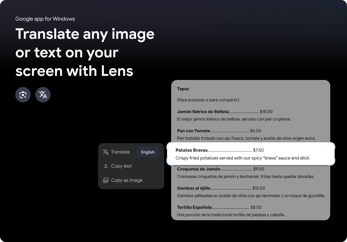 Meanwhile, next to the “Search your files, web, and screen” bar is Google Lens for Circle to Search-like functionality on Windows. It lets you highlight text and images to translate, while you can also just copy text.