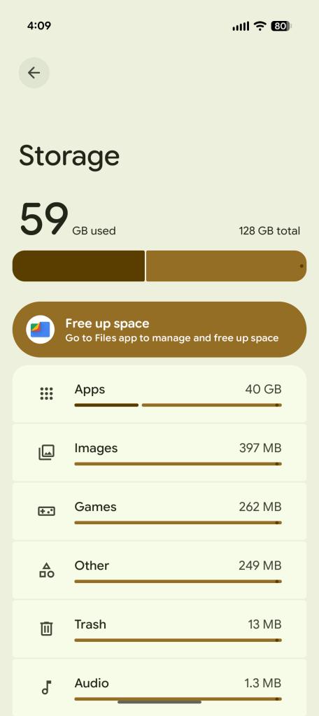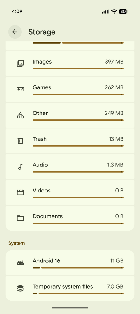 The base Pixel 10 ships with 128GB of UFS 3.1 storage (as does the base Pixel 10 Pro) — not the faster UFS 4.0 storage found in the 256GB models. Around 11GB of that is taken up by Android, while another chunk (7GB, in my case) is reserved for cache and other temporary system files. That leaves users with around 110GB of usable storage, the bulk of which is taken up by apps and their associated data.