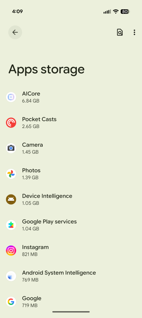 Except, not really. What’s taking up the most space on my Pixel 10 isn’t some big mobile game, nor is it a massive collection of photos and videos or my entire streaming music library. At the moment, it’s AICore, the local LLM component necessary to power all of those AI-based tools that amount to the vast majority of Google’s advertised exclusive features. It weighs in at nearly 7GB of space, and while that might not sound massive on paper, it’s more than 6% of this Pixel’s total usable storage and, presumably, will only grow as necessary to power even more AI tools.