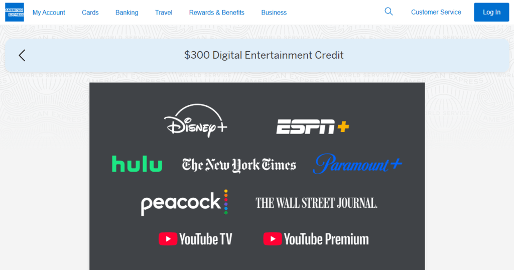 Experience the latest shows, news and recipes. Get up to $25 in statement credits each month when you use your Platinum Card® for eligible purchases on Disney+, a Disney+ bundle, ESPN+, Hulu, The New York Times, Paramount+, Peacock, The Wall Street Journal, YouTube Premium, and YouTube TV when you purchase directly from one or more of the providers. This can be an annual savings of up to $300. Enrollment required.‡