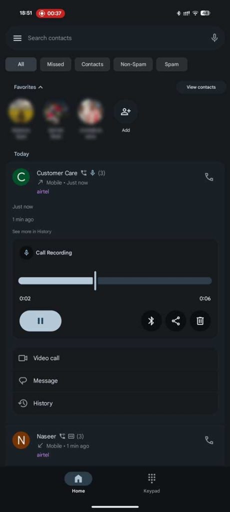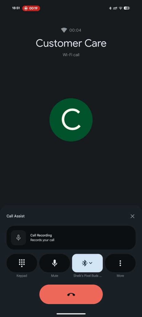 In an active call, the Call Recording option appears in the Call Assist pill, similar to Call notes. Once tapped, it begins automatically. The recorded call is then viewable in the calling card from the Recents section.