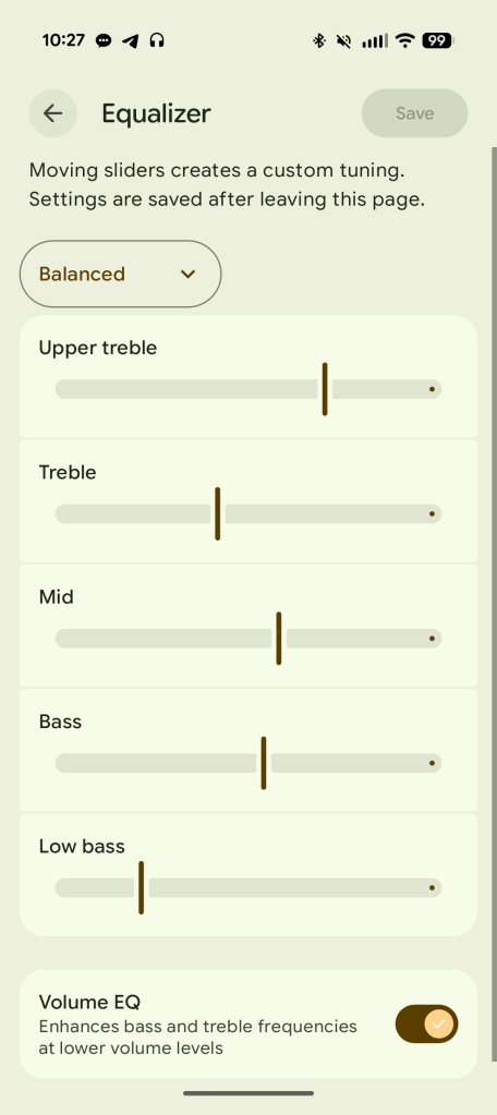 “Good, not great” appears to be Google’s theme when it comes to the actual audio components found within these earbuds, as that phrasing applies to practically every aspect here. For example, with the EQ set to Balanced — my personal preference for listening to music — the bass lines on Geese’s “Trinidad” hum along perfectly underneath the refrain without washing out the blasting horns or the never-ending hi-hat march. Still, the entire thing sounds a little muffled, as if, no matter how close I get to the music, it always feels like there’s a paper-thin wall separating myself from the band.
