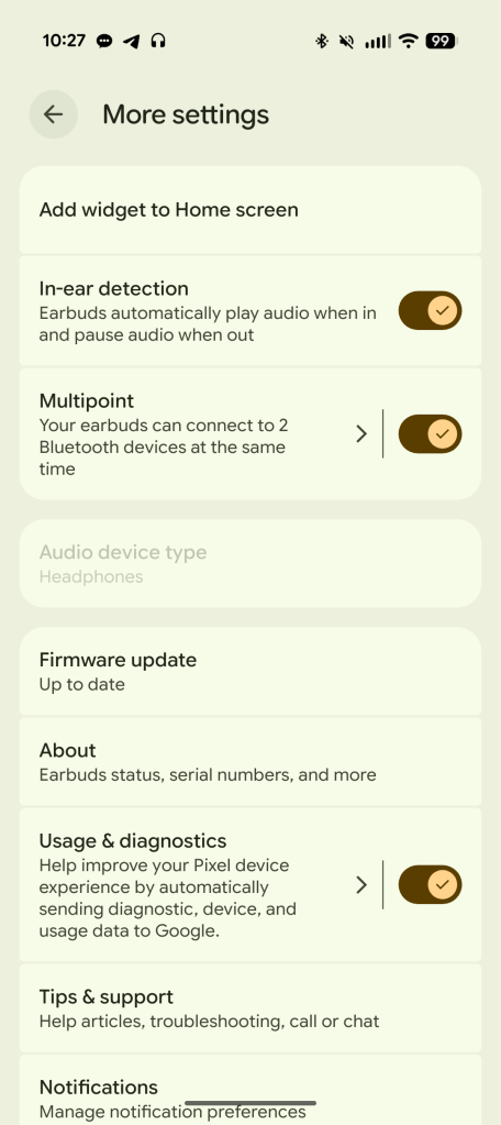There are a couple of settings you’ll want to pay attention to if you’re planning on picking these up. The first is multipoint, which the Pixel Buds 2a do support, but you’ll need to enable it under the “More settings” option at the bottom of the page. You’ll also want to make sure your earbuds are saved to Find Hub, should you misplace them while disconnected. This is part of the setup process Google walks you through after unboxing, but it’s good to double-check before anything goes missing.