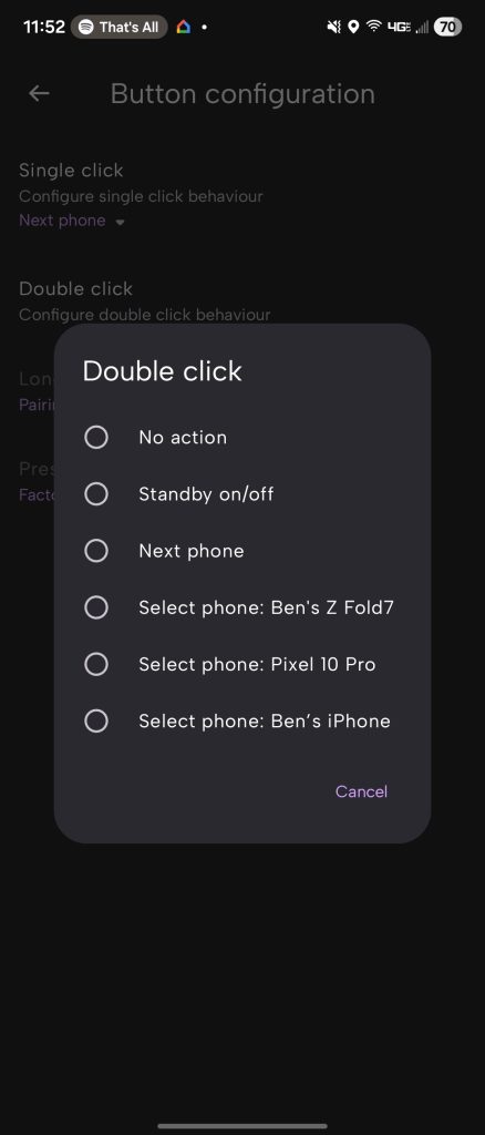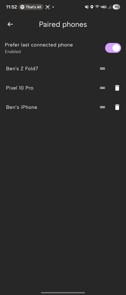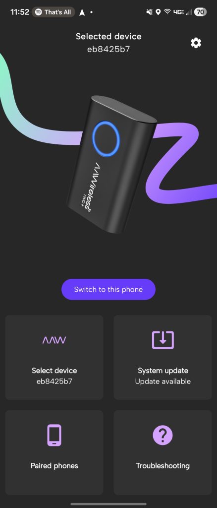 The button on AAWireless TWO+ makes it literally thoughtless to switch between connected phones. The adapter will automatically prioritize the last-connected device, but a single press swaps to the next one in line. If that phone isn’t nearby, it moves on to the next one. In the car I’ve been testing this in, I’ve been using it with my Galaxy Z Fold 7, my iPhone 15 Pro, and my wife’s Pixel 10 Pro. It’s pretty darn seamless.