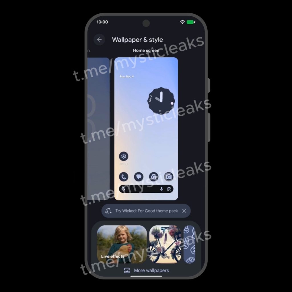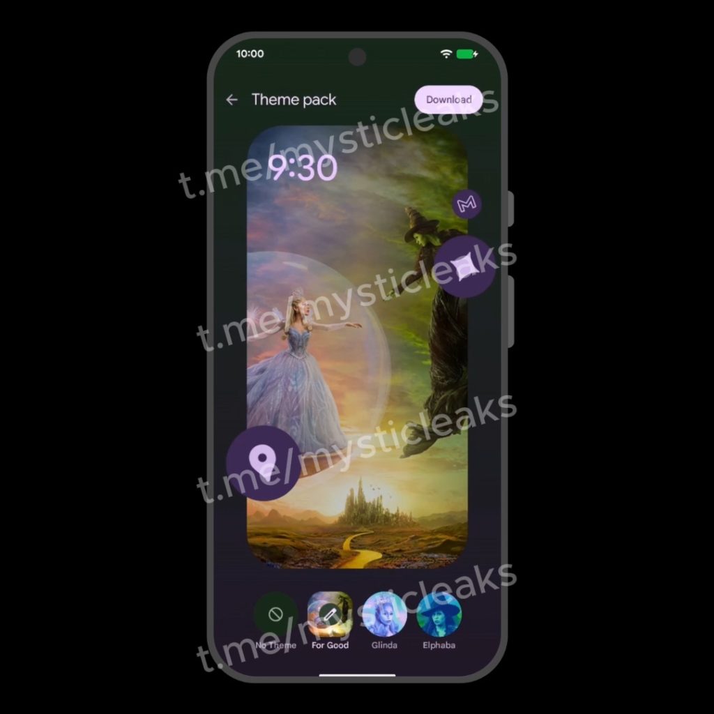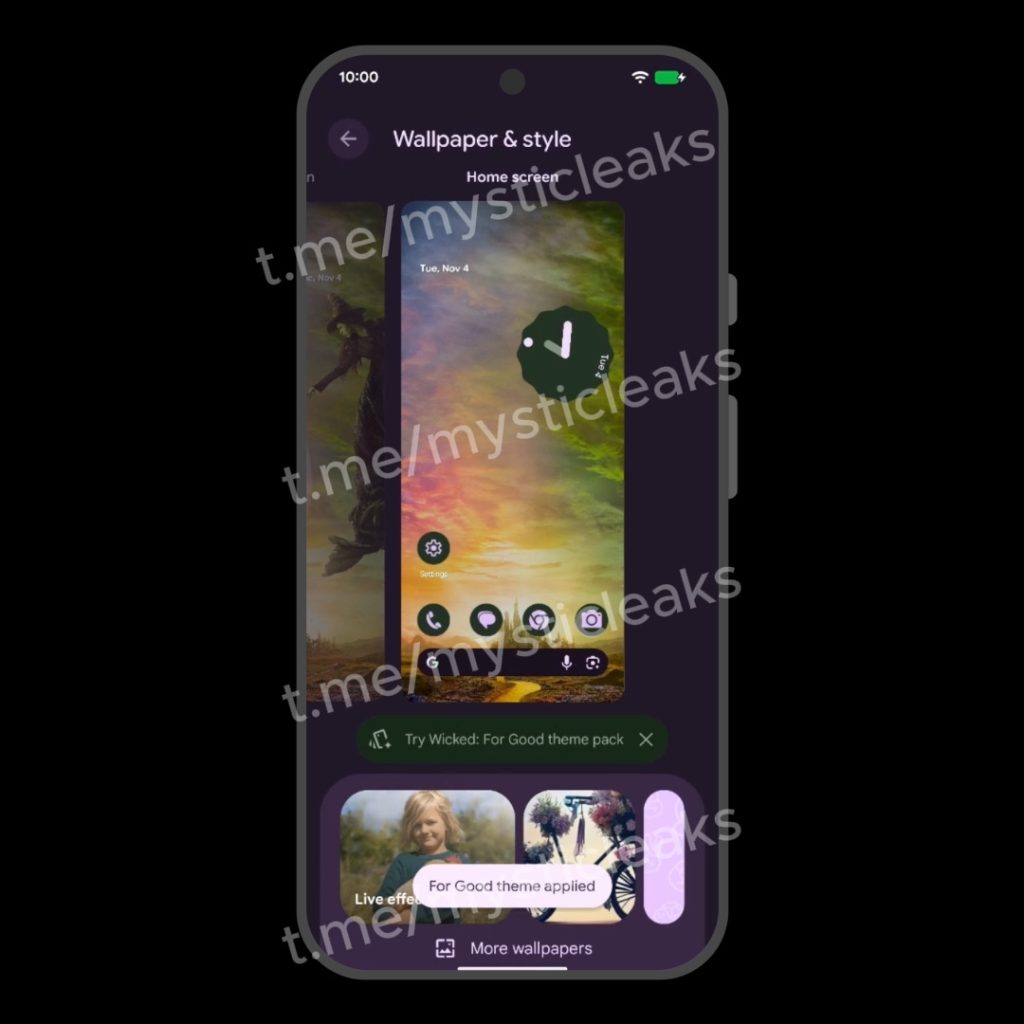 Starting with theme packs, this new feature would give Google Pixel devices a one-tap theme. This seems to be a glorified wallpaper selection that auto-applies themed icons to match. Google is, based on the screenshots and videos, launching this starting with a “Wicked: For Good” theme pack that seems to include “For Good,” “Glinda,” and “Elphaba” themes within a pack.