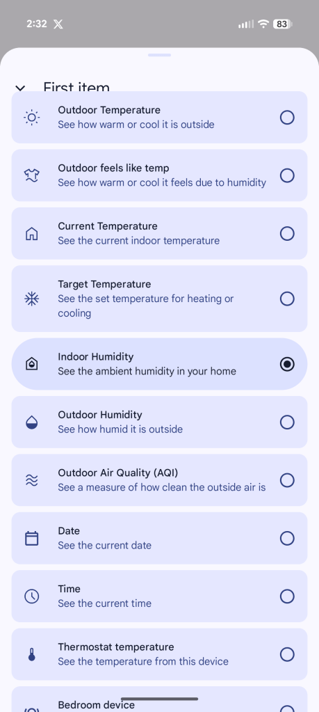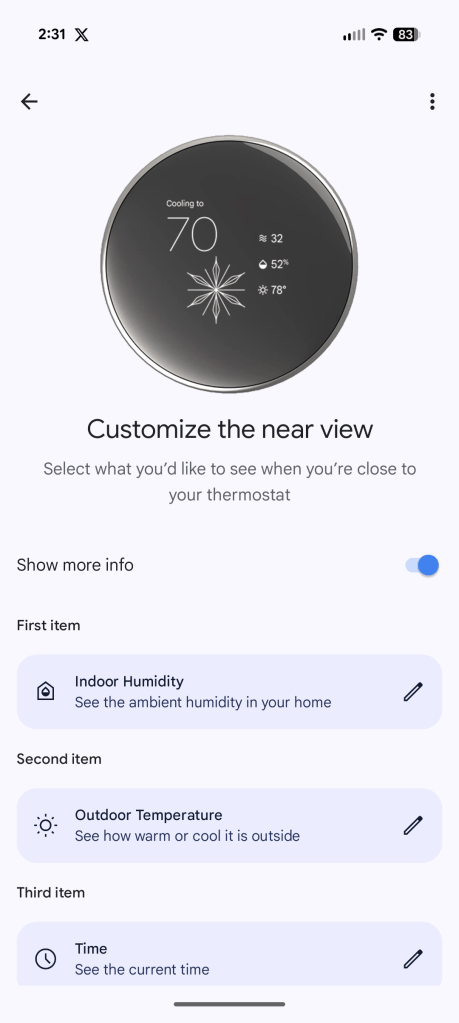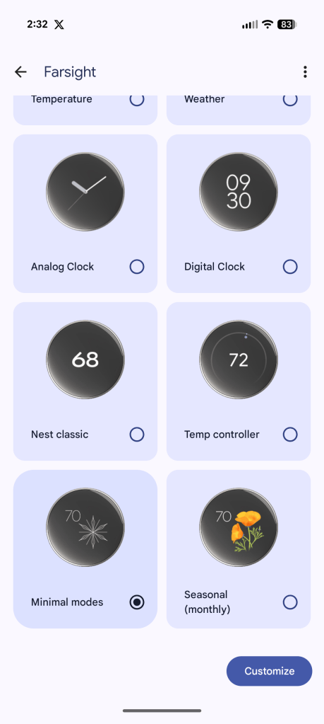 To access the new faces, open the Google Home app and access your thermostat. From there tap Settings > Farsight and you can pick your active face, as well as customizing the “near view” with a variety of different information including the current indoor and/or outdoor temperature, the time/date, humidity levels, and more.