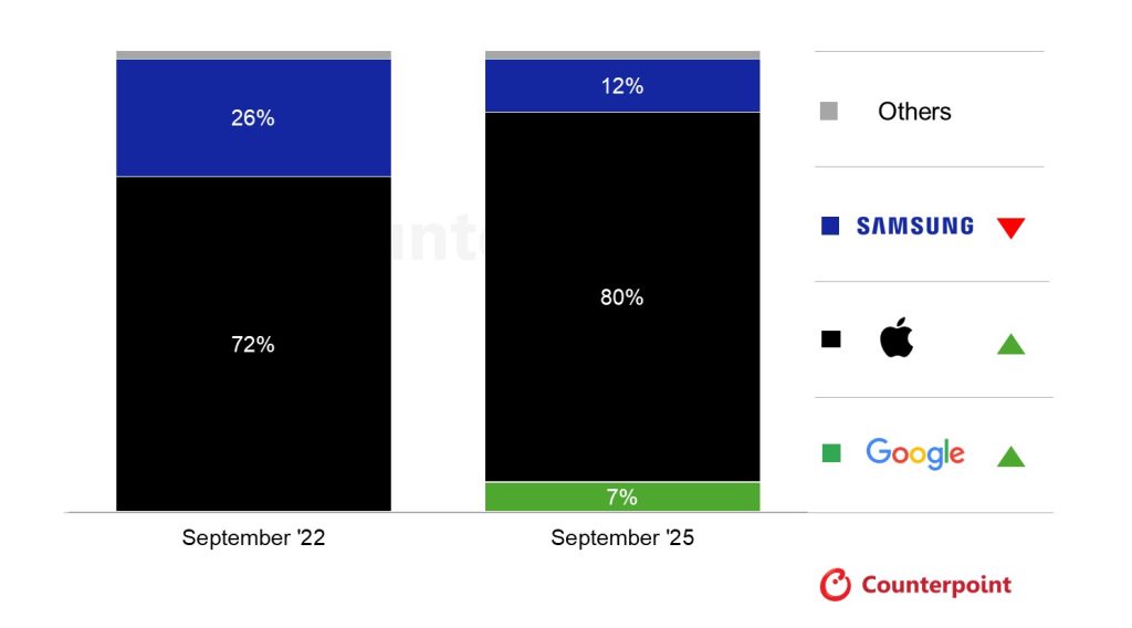 Verizon saw a similar split in this premium $600+ market, hitting about 7% market share after riding at 0.1% in 2022. Only AT&T customers have been slow to try out Pixel, with just 2.3% of sales in this price range. While this certainly sounds like small potatoes compared to Apple (and even Samsung), it shows some real momentum on Google’s part, even in the face of Apple’s iPhone 17 series.