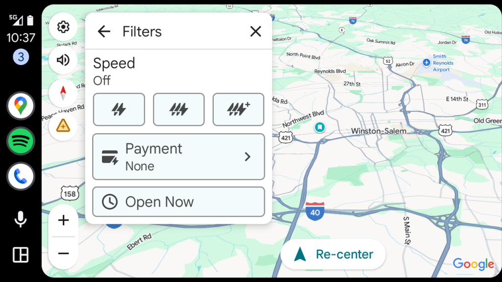 As it stands today, Android Auto allows EV owners to start a search for a nearby charging station and access filters for factors such as charging speed, but the filters need to be applied on each search. The filters only appear when actively searching for a charging station.