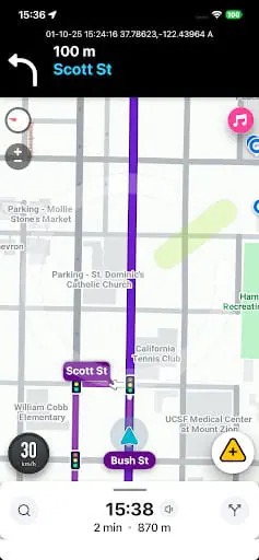 Like with Google Maps, traffic lights in Waze appear along your selected navigation route, meaning you won’t see them at intersections that you aren’t approaching. That’s probably for the best as far as clutter is concerned, as Waze can occasionally be a little overwhelming in terms of how many incident icons it might show in a certain area.