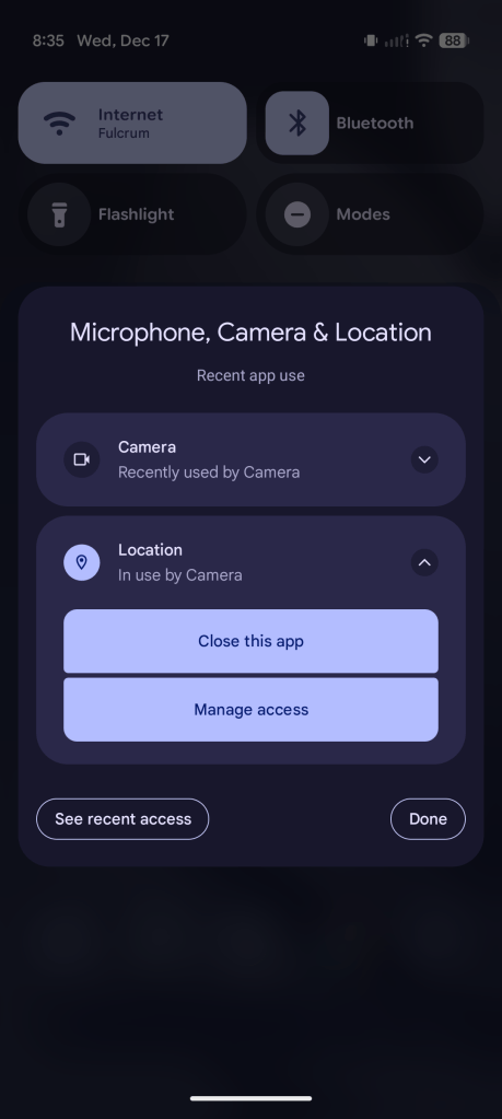 Back in 2021’s Android 12 release, Google added a new green dot to prominently notify the user that an app was using the camera or microphone on your device. The dot shows next to your battery icon and, in the notification shade, can be tapped to show which apps have accessed those permissions.