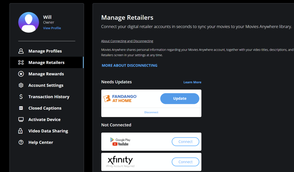 If you don’t receive this email, though, you can still manage your connections from within Movie Anywhere’s account preferences. Head over to the main Movies Anywhere homepage, log into your account, then select Settings from the dropdown menu in the top-right corner. Select Manage Retailers from the sidebar, then click the Connect button next to Google’s listing. From there, the steps should basically follow the same flow described above.