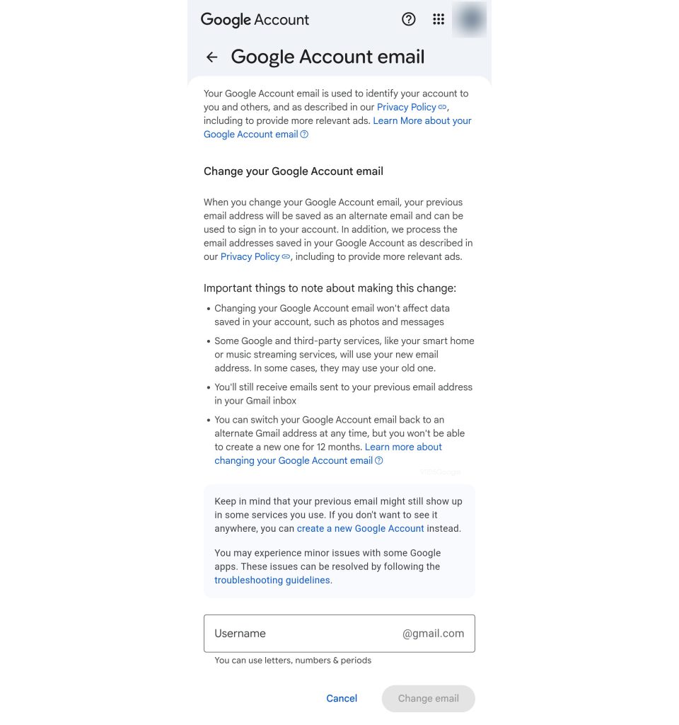 After tapping “Change Google Account email,” you’re presented with a second screen that explains what happens when you change your Gmail address, how it affects various Google services, and confirms you can switch back “at any time.”