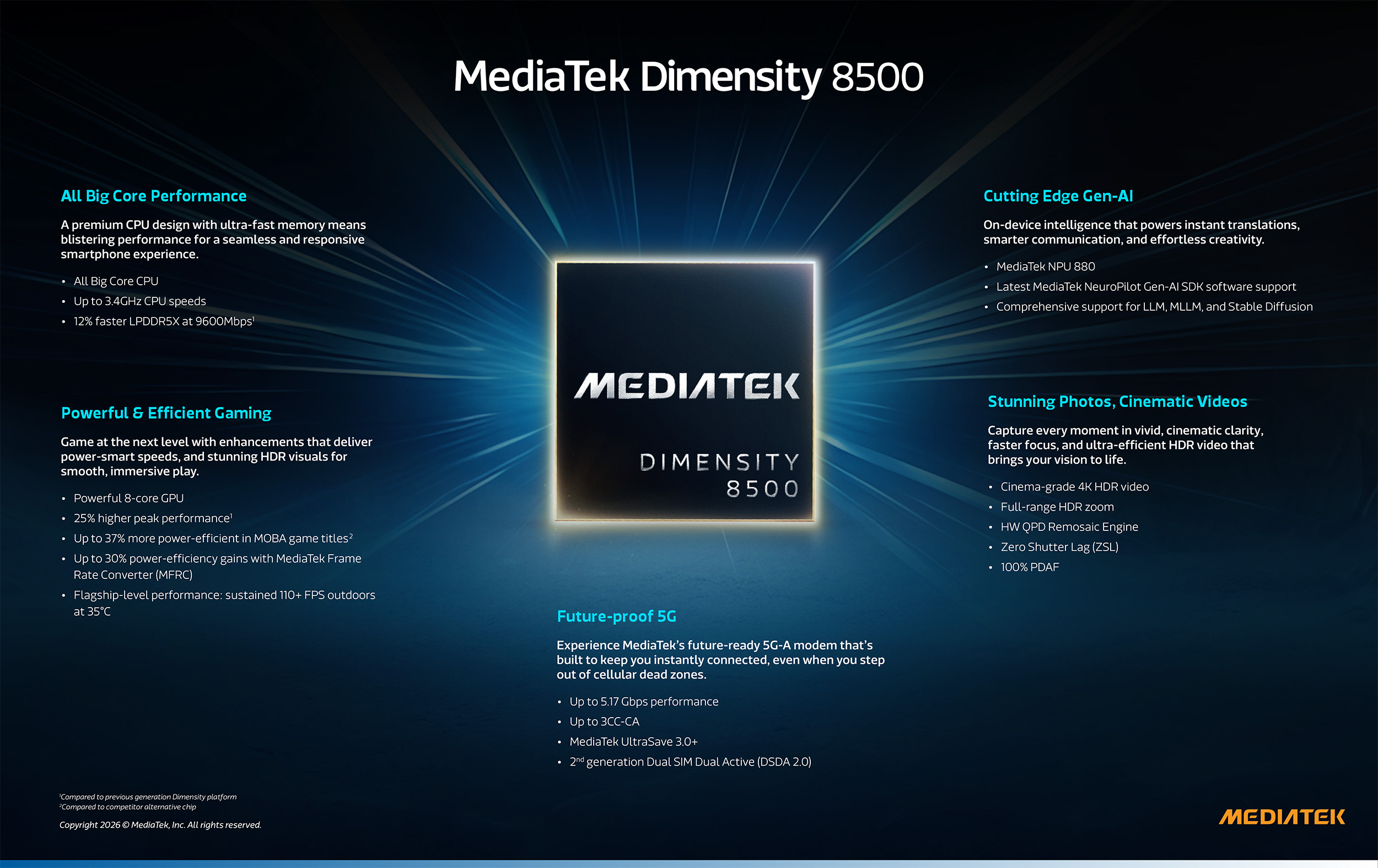 Meanwhile, MediaTek Dimensity 8500 takes things down one more step with a 4nm process and an “All Big Core” build consisting of eight Cortex-A725 cores. That’s paired with a Mali-G720 GPU.