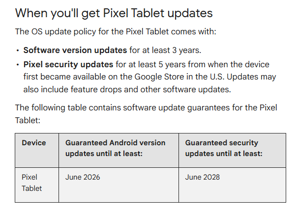Google quietly updated its support page for the Pixel Tablet to show that both Android OS and security updates will now continue through June 2028, where it previously showed that OS updates would end in June 2026.