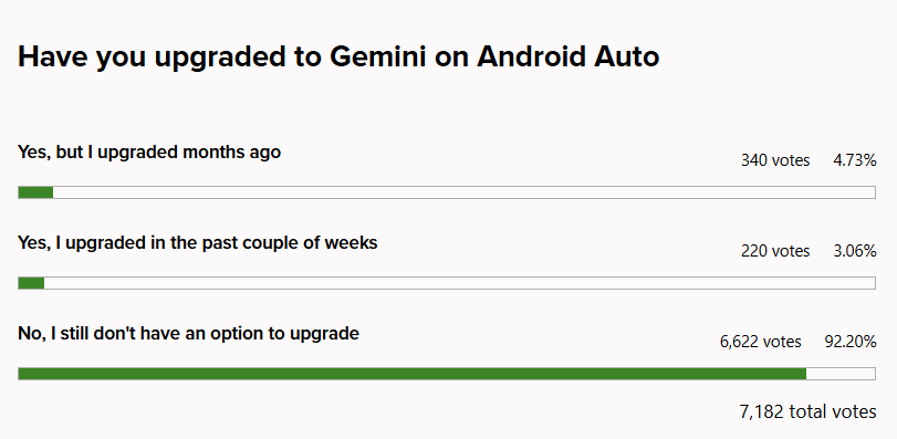 That’s out of nearly 7,200 total votes cast, with a mere 3% having seen Gemini arrive in “the past couple of weeks.”